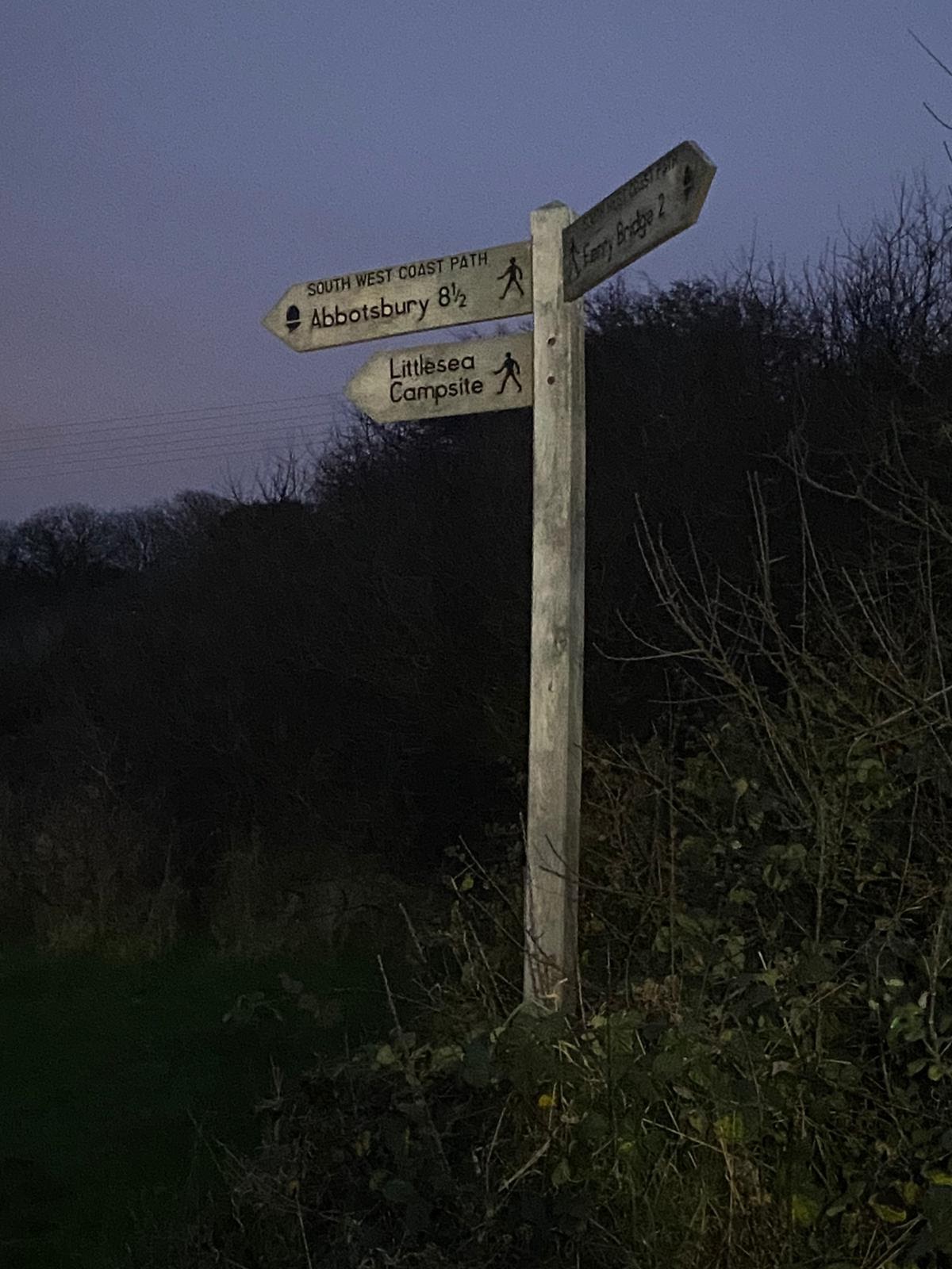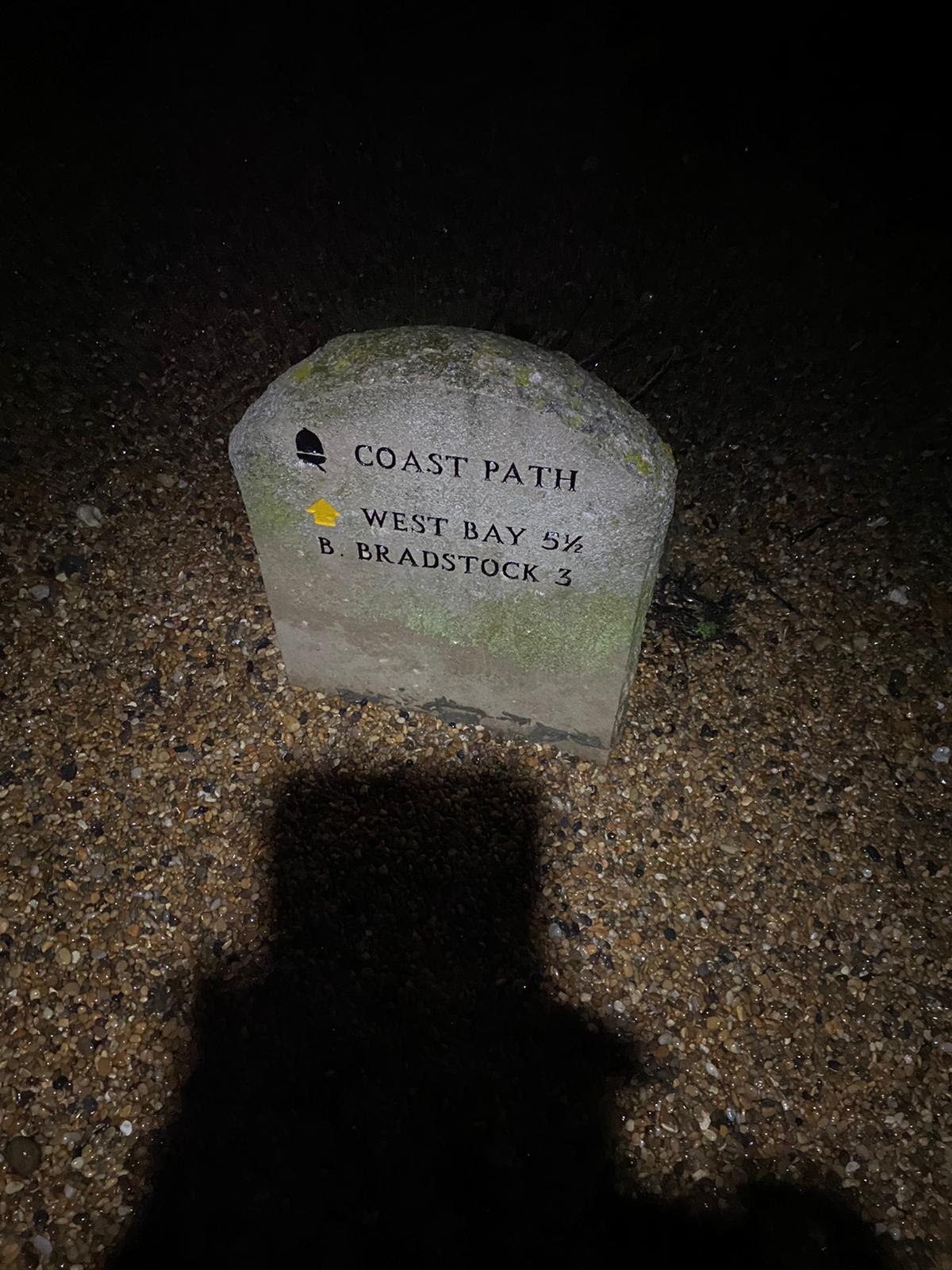 Abbotsbury just never seemed to get any closer. Each time we reached a SWCP marker (normally a welcome sight) we were still 3 miles away! As we finally reached the Swannery (longest 3 miles ever) we headed back towards the coast. Chesil Beach appeared to our left and with the sea only metres beyond that, navigation from this point was relatively straight forward. Keep the sea on the left and keep moving forwards until we reach West Bay. As it got later and fatigue started to kick in the dark certainly made things look a bit different. At one point there was a close call when a cows feeding trough looked suspiciously like a stile nearly resulting in some very soggy shoes and even a moment when some boulders looked like sleeping sheep!