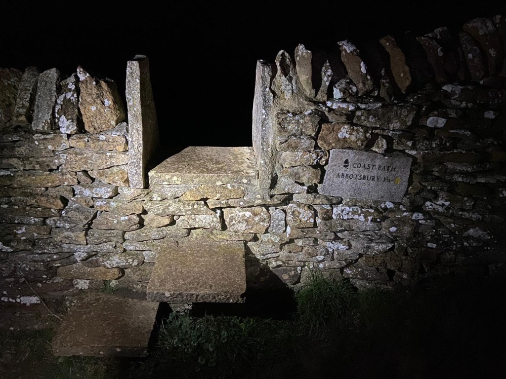 Towards Abbotsbury end of the Fleet, the path heads inland to bypass a wildlife conservation area. This took us through a couple of fields and in the darkness up ahead we spotted multiple sets of eyes glinting in our head torch light. A simple heard of cows settling down for the night in the middle of our path all of a sudden looked like a herd of angry bulls! An attempt at “mooing” good evening to them may have been misinterpreted and as they started to stand up we made a quick exit. Only 2 minutes later in a more wooded section, a group of pheasants decided to take flight through the trees causing both of us to jump and our heart rates rocketed! Not sure either of us would be too comfortable out here alone at night!