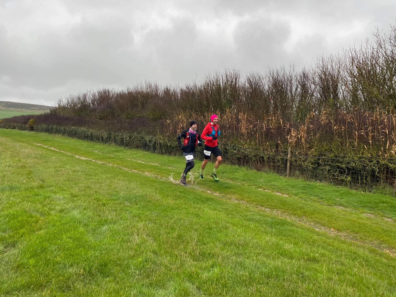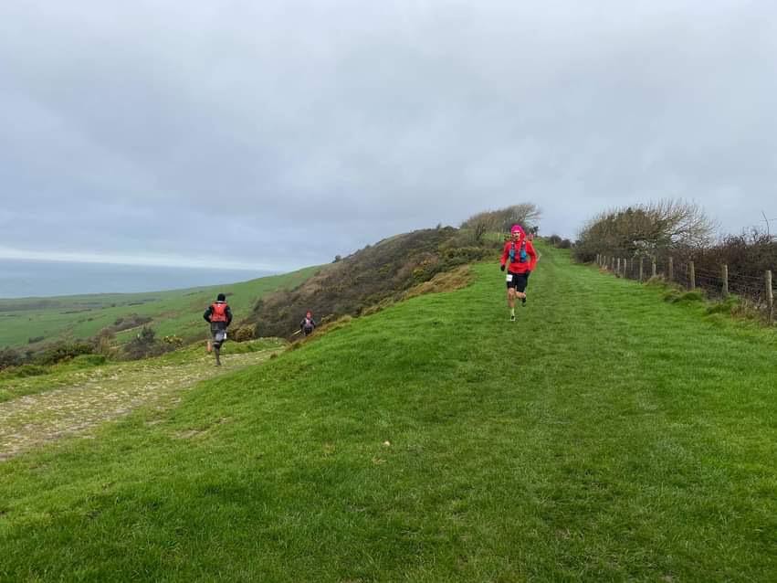 The conditions were wet and slippy as anticipated but the wind was much stronger than expected. As the day broke and we could turn off the head torches it was pretty obvious the weather was going to be like this all day. The first 10km out to Lulworth ticked by nicely, first feed in after 30 minutes and walking up the steep hills whilst running the rest. On the return leg we were passing other runners going out from later starts. Seeing Kirsty going strong lifted the spirits and the general camaraderie with other runners on the trail was brilliant. First loop done quite comfortably and it was back up the first climb to to do loop the 10km runners were taking on the following day. The condition of the trails were now getting a lot worse underfoot though and grip was disappearing fast. My shoe choice was now really shining through as they gripped on the descents and held strong on the flats and climbs as well and as Giles took the first of what was to be his fair share of falls for the day I was incredibly grateful to still be on my feet.