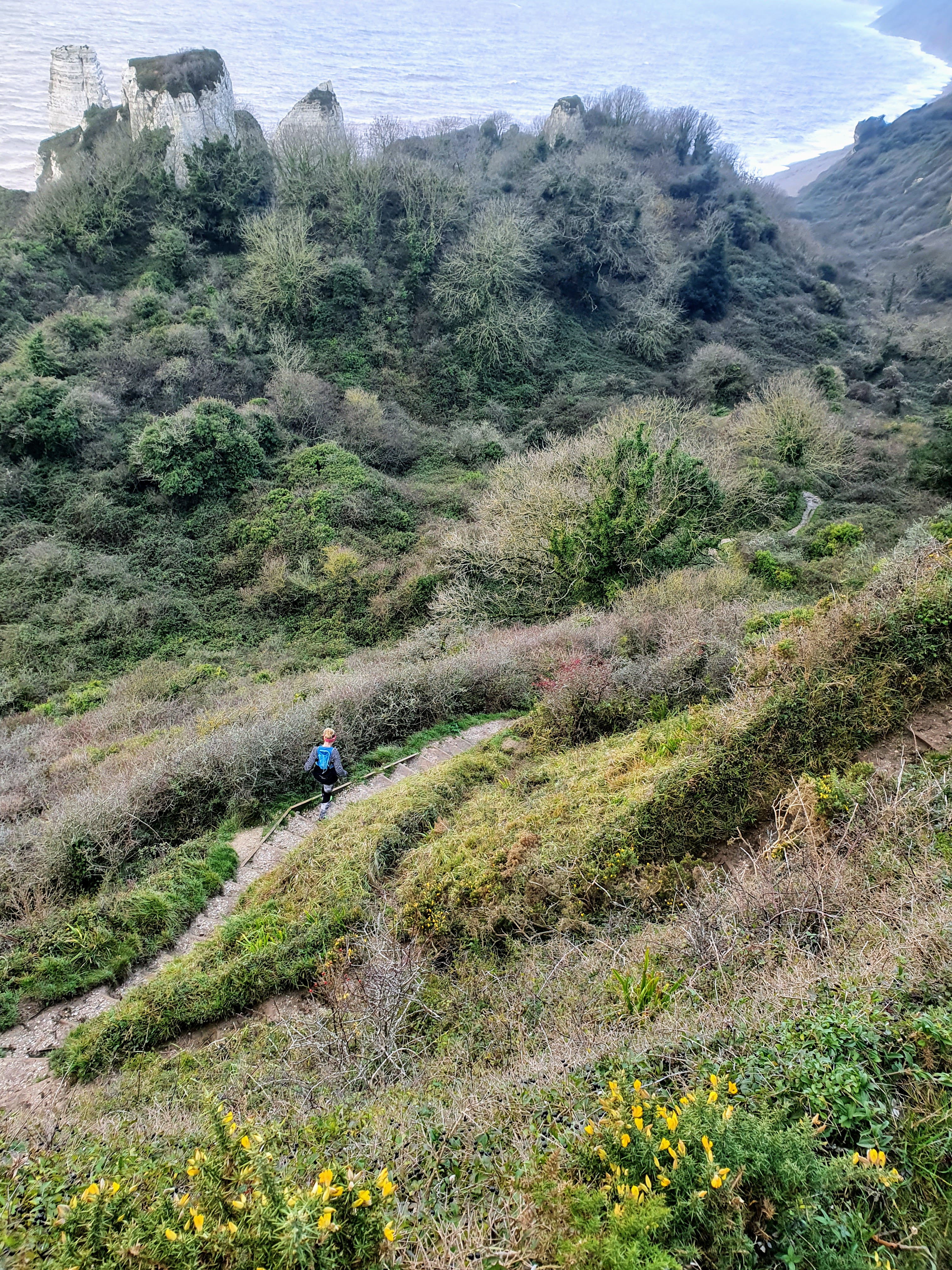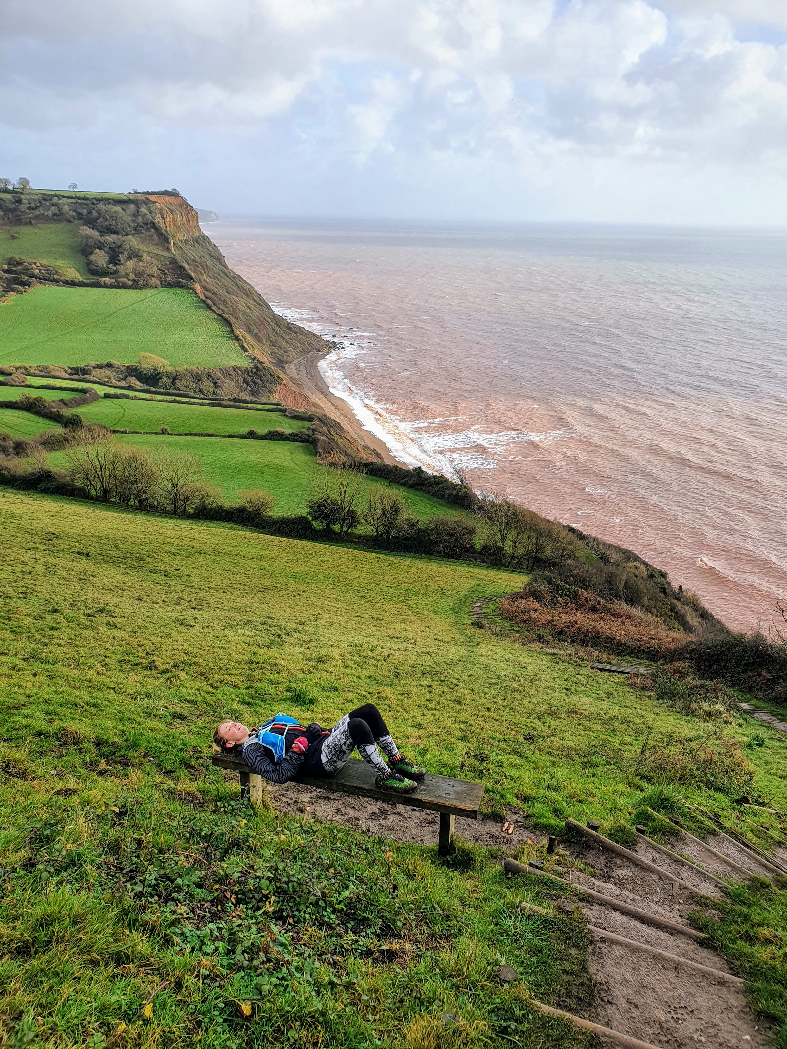As the miles ticked off the climbs and descents to secluded beaches continued, grateful that the pebble sections were nothing like we experienced on Chesil Beach a few weeks ago. We hit a couple of significant climbs that really stung the legs, with one of the biggest flights of steps we have come across so far. This brought with it stunning views all the way back into Dorset but also the need for someone to take the opportunity for a lie down!