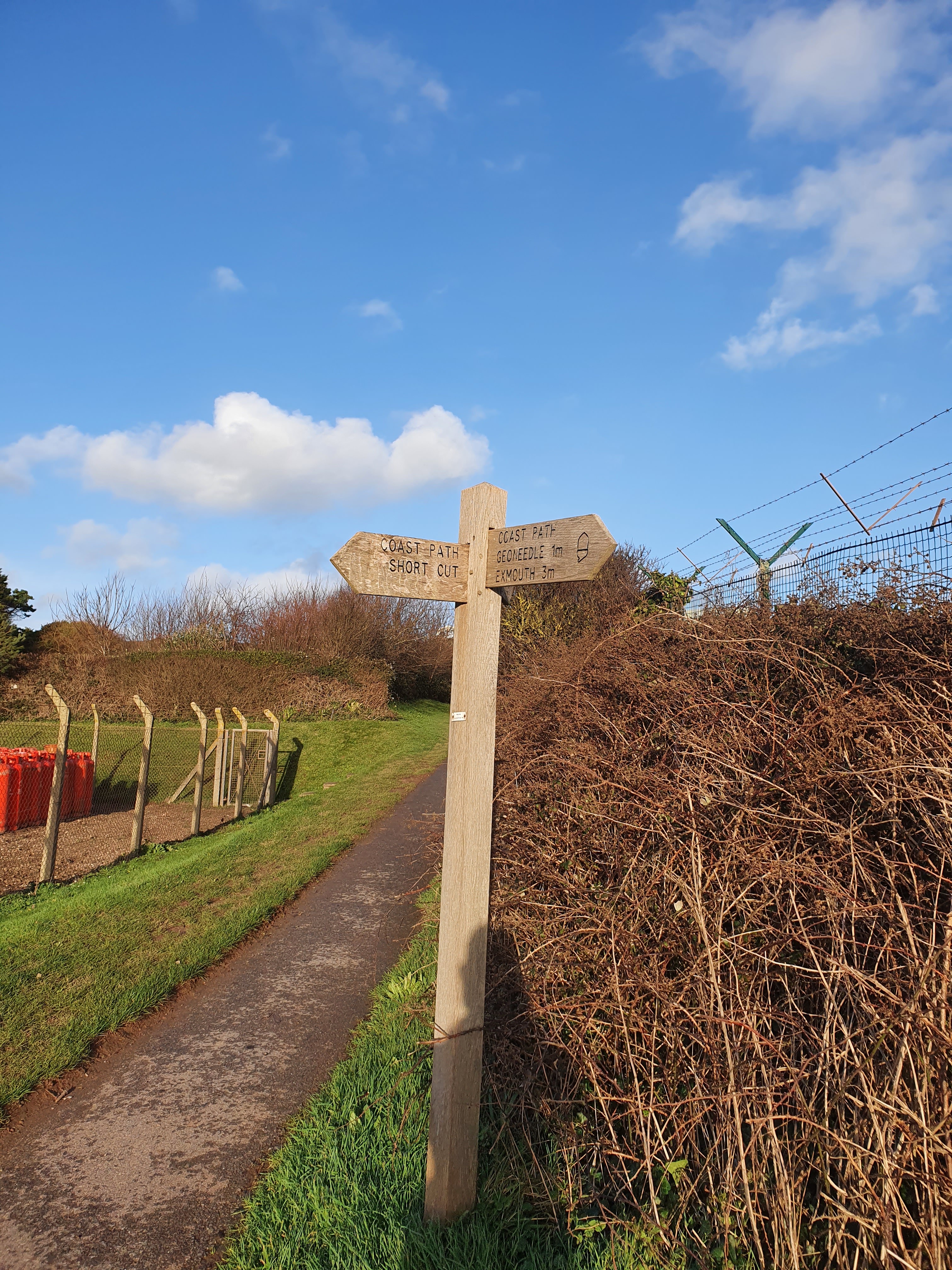 We could see Budleigh Salterton from quite a way out, as the path followed the edge of a field towards the town. The path then takes you quite a way inland to cross the river mouth then back out to the sea front. With only a few miles to go at this point we were both feeling tired and hungry. We hadn’t managed a coffee and cake stop on this leg despite a couple of opportunities but knowing we weren’t far from Exmouth we took the path straight out the town and into the final few miles. A long climb out opened up stunning views again and we could see the rough direction of travel ahead, right through a holiday park. Some really soggy and sloppy sections of grass helped soak the feet one more time and as we worked our way through, the signs once again caught our attention. One sign read 1.5 miles to Exmouth and the other one said 3! A couple of minutes later we saw why – there was an offer of a shortcut! Despite both feeling tired and hungry now we decided to keep it honest and follow the full route via the Geoneedle towards Exmouth. Just as we approached the stone spire and started to read up on its history with Exmouth in the background the first rain shower of the day hit and we moved on quickly. Dropping down onto the seafront and heading towards the car!