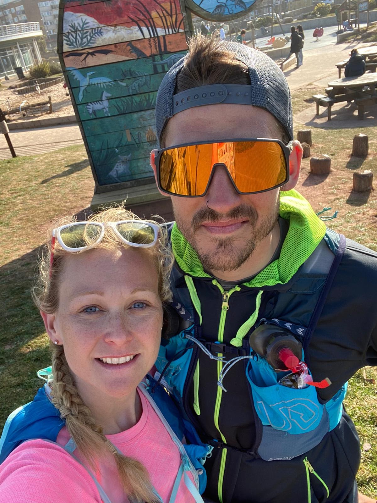 Getting off the train and picking up the signs with the familiar Acorn, we set off from Starcross station knowing initially this run was going to be OK, the first 10km pretty much flat on a mix of road/footpath and light trail through Dawlish and Dawlish Warren would break us in gently before picking up the tougher trails later on in the run. The sun was out and this was the first leg outside of full winter conditions and it was amazing to swap base layers and rain coats for T-shirts and sunglasses. The first hour went by nicely, a little diversion through the town but we made good progress and were soon well on our way to Teignmouth. The first of the hills came as we made it back onto more familiar coast path territory. A diversion round the edge of a Golf Course, a few wrong turnings where the signage had gone missing added a few extra challenges but stunning scenery and the promise of Ice Cream at the next stop kept spirits high. Dropping into Teignmouth, the path flattens out as you pick up the footpath next to the train line again which had been very familiar from the early miles of the run. We reached the ferry crossing to Shaldon and found exactly what we were looking for, an ice cream hut!